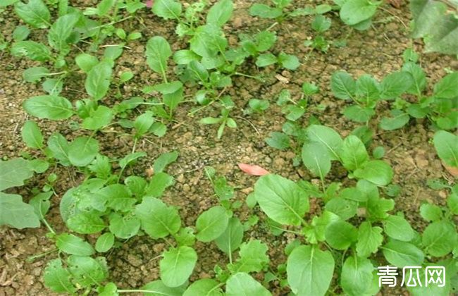 播种前要先淋水,使得土壤湿润,再将种子均匀的撒播在畦面上,播种后用稻草或草木灰、火烧土等覆盖,再淋水,这样能使种子和土壤紧密接触。在高温期播种易造成徒长,可适当疏播,而秋冬季节可适当密播。一般播种1-2天后即可出芽,冬季气温低,出芽时间较差,可先催芽后再播种,缩短苗期,在出苗后要经常保持土壤施入,在干旱时要早中晚各浇水一次,浇水要注意浇水量,水点要细,以免冲坏幼苗。出芽10-15天后即可施入饼肥,之后每隔5天施肥一次,苗期大约要施肥3次。当幼苗生长出1-2片真叶时进行第一次间苗,将过密苗、病苗、高脚苗等除去,当生长出3-4片真叶时进行第二次间苗,并结合补苗,使植株生长整齐。