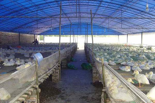 (2) 用楠竹片或树木筑成圆形棚顶或房屋形状的框架,上面和两边墙用塑料薄膜盖严,棚的地面宽度和高度以2米为宜。有的可建4米宽,棚的长度以养鸭多少而定,一般在5~10米。注意在覆盖塑料薄膜时两边一定要用沙石压严,并在两边挖一条V字形的小沟以备流水。棚的两头(出入口处)也要盖上塑料薄膜,晚上盖严,白天敞开。